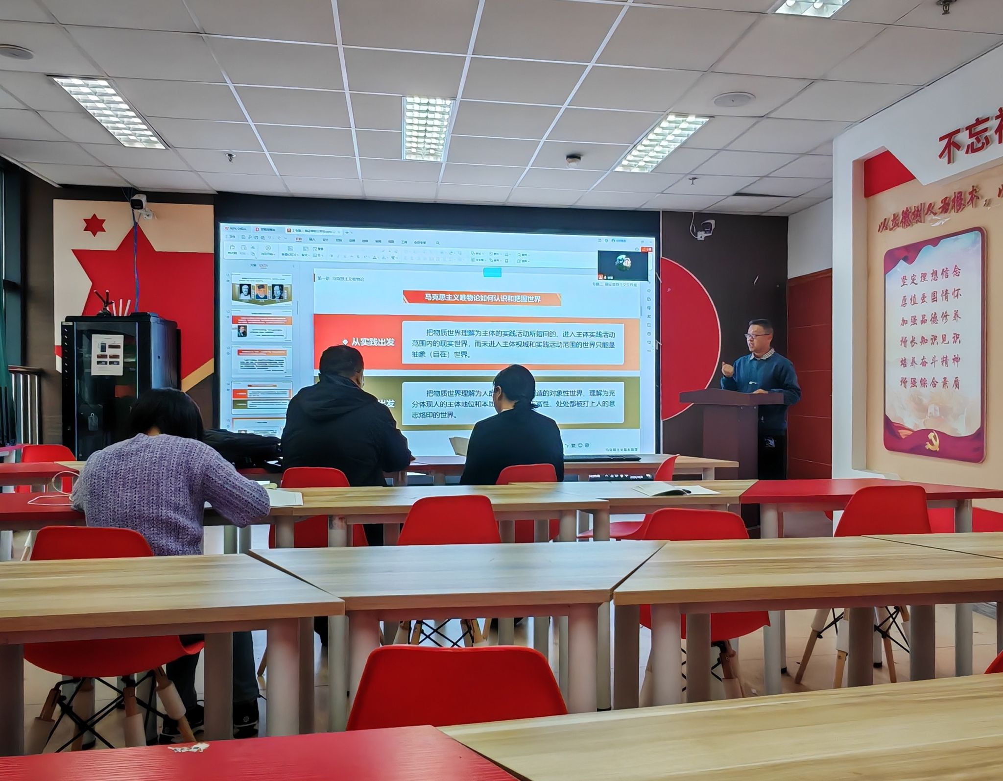 首先,熊小果做教学展示,并就哲学基本问题、“物质”概念、人工智能、自否定等知识点的教学方法、思路、案例作了详细讲解。随后,老师们就熊小果的教学展示进行了评议,同时踊跃分享了各自相关内容教学的经验、心得,也有教师提出了自己在备课、讲授过程遇到的各种疑惑和难题。最后,副院长邱高会给予本次集体备课会以肯定性评价,要求每一位教师都要有效参与并有效利用集体备课会,以达到讲好“原理”、教好学生和相互交流、互相进步的目的。
