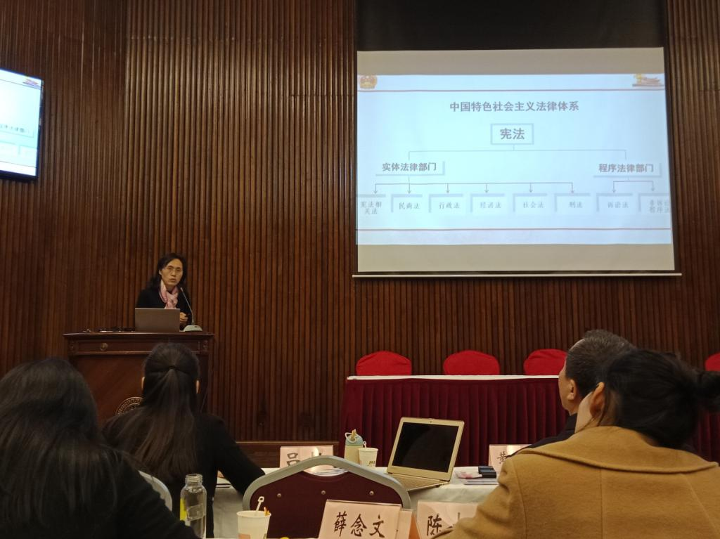 本次研讨会由专家主题报告、教学展示和教学疑难解析研讨三部分构成。高国希教授、李辽宁教授、曹银忠教授、陈大文教授分别以“作为社会价值形态的道德与法律”、“基于价值引领的高校思政课创新研究”、“精准思维促改革 守正创新赋新能”、“新时代学校法治教育发展与教材建设”为题,做了主题报告;来自17所高校的教师进行了教学展示与主题发言。我校教师李晓辉对教材第六章第二节“以宪法为核心的中国特色社会主义法律体系”进行说课展示。