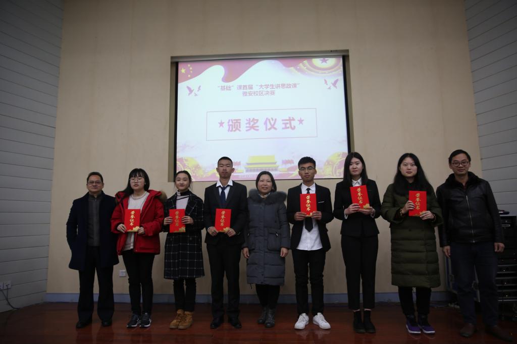 12月12日和14日,首届“大学生讲思政课”决赛分别在雅安校区和成都校区举行。马克思主义学院院长赵晓霞,党委书记杨世义,副院长颜怀坤,教务处副处长陈礼清、刘涛,信息工程学院党委书记张禧,动物科技学院党委书记潘宏,环境学院党委书记袁志香及马克思主义学院基础课教研室主任唐平、成都校区教学部主任宁娜、“形势与政策”课教研室副主任傅新禾等老师担任嘉宾评委。