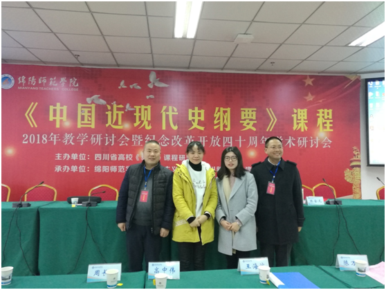12月8日,四川省高校《中国近现代史纲要》课程2018年教学研讨会暨纪念改革开放四十周年学术研讨会在绵阳师范学院举行。来自清华大学、华南师范大学、西南交通大学、四川师范大学、四川警察学院等高校的相关领域专家,省内外近百名高校的马克思主义学院负责人和《中国近现代史纲要》课教师参加了此次会议,我院《中国近现代史纲要》教研室主任张祖龑及任课教师尹君、马国华、聂娟参会。