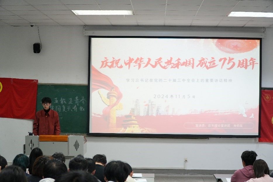 为热烈庆祝中华人民共和国成立75周年,进一步激发同学们的爱国情怀,11月5日,草业科技学院和园艺学院联合举办了主题为“75载正青春,强国复兴有我”的示范性班团活动。右木理论宣讲团成员肖钧友面向园艺学院、草业科技学院团支部,开展了“认识党的二十届三中全会”专题宣讲。