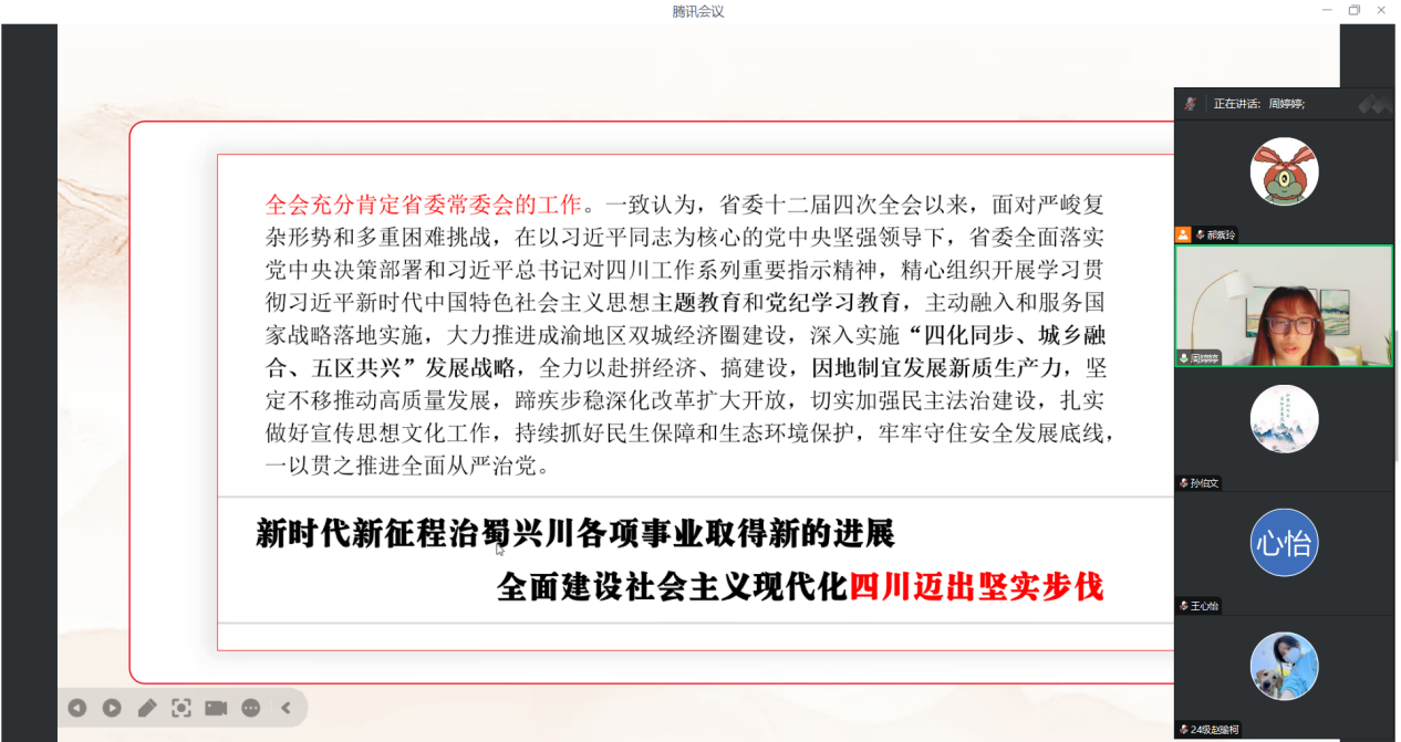 在宣讲会上,周婷婷以“学习贯彻省委十二届六次全会精神,助力四川谱写中国式现代化新篇章”为核心议题,深入阐释了省委书记王晓晖在省委十二届六次全会上的重要讲话精神,详细解读了《中共四川省委关于深入贯彻党的二十届三中全会精神,进一步全面深化改革、奋力谱写中国式现代化四川新篇章的决定》中关于进一步全面深化改革的重大战略规划。宣讲内容围绕“坚定信念,深刻领会省委全会精神实质”、“实践探索,全面回顾四川改革发展的坚实步伐”、“开拓创新,共同擘画四川全面深化改革的美好未来”三个层面展开,呈现了一场精彩的主题宣讲。此次宣讲,主题鲜明且紧扣时代脉搏,重点突出且全面,内容丰富并融合了理论与实践的深度。