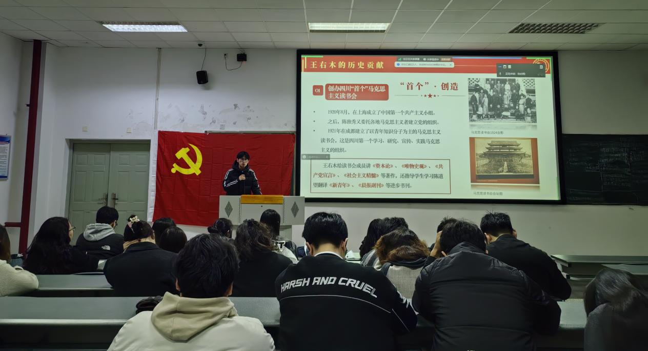 首先,唐鸿林借助电视剧《觉醒年代》中李大钊、陈独秀相约建党的影视片段,引出了中国共产党的诞生历程以及四川早期党团组织的主要创始人王右木。在此基础上,他依托丰富的历史资料,详细介绍了王右木烈士创建马克思读书会,创办四川首个公开系统宣传马克思主义的革命刊物《人声》报,成立中共成都独立小组,最终在军阀的迫害下不幸牺牲的伟大一生。其次,他深刻总结了王右木同志的历史贡献,并结合治蜀兴川的伟大实践,阐释了当代蜀地儿女传承和弘扬王右木同志精神的具体行动。最后,他号召大家以实际行动践行王右木精神,坚定理想信念,积极承担时代赋予的责任,为中国式现代化事业贡献自己的青春力量。