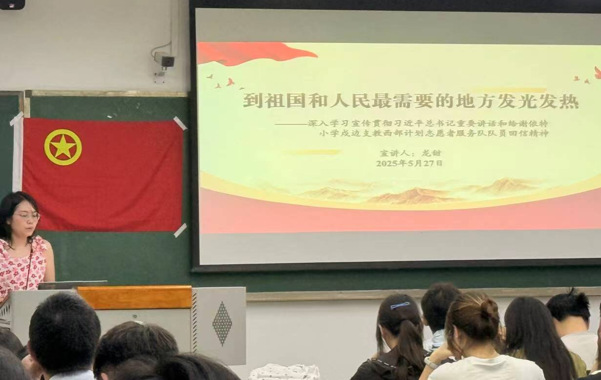 为深入学习习近平总书记给谢依特小学戍边支教西部计划志愿者服务队队员的回信,激励新时代青年在中国式现代化建设中挺膺担当,2025年5月27日,ok138cn太阳集团529右木理论宣讲团成员龙甜面向ok138cn太阳集团529环境学院环境工程2024级本科生团支部开展了以《到祖国和人民最需要的地方发光发热》为主题的宣讲。