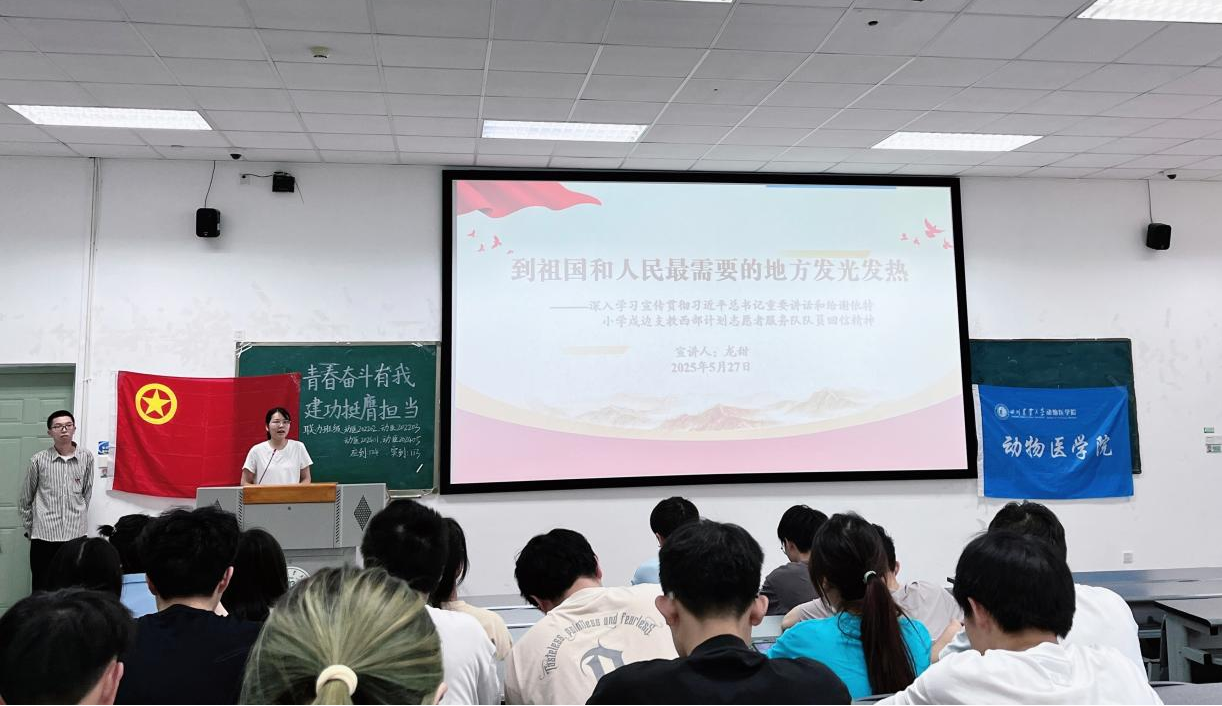 为深入贯彻落实习近平总书记给谢依特小学戍边支教西部计划志愿者服务队队员回信精神,深入领会5月1日第9期《求是》杂志中习近平总书记发表的重要文章内涵,2025年6月5日至6日,ok138cn太阳集团529右木理论宣讲团成员龙甜,走进动物医学院和管理学院本科生团支部,开展了两场以《到祖国和人民最需要的地方发光发热》为主题的宣讲活动。