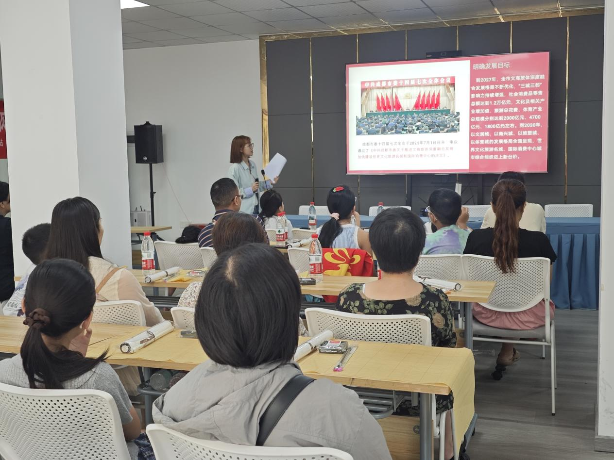 为深入学习贯彻成都市委十四届七次全会精神,推动全会部署的 “文商旅体融合发展” 战略在基层落地见效,切实让政策红利惠及社区居民生活,9月6日上午,成都市新都区桂湖街道锦水苑社区组织开展了主题为“聚焦成都市委十四届七次全会精神,文商旅体融合点亮新都生活” 的专题宣讲活动。本次宣讲由ok138cn太阳集团529“右木”理论宣讲团主讲,社区居民、社区工作者等20余人到场参与。