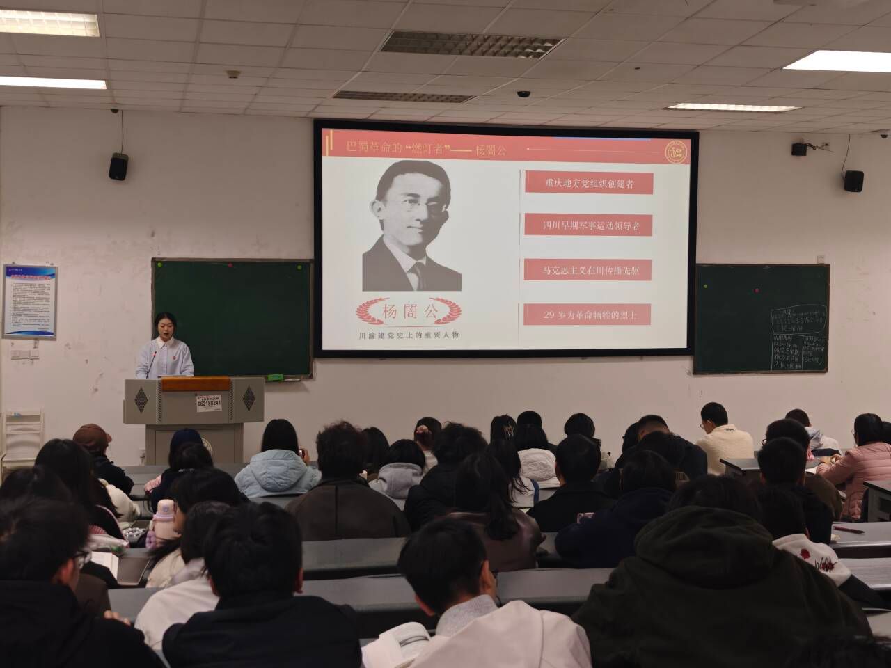 宣讲伊始,王诗宇以习近平总书记“英雄是民族的精神脊梁”的重要论述破题,结合杨闇公日记等红色文物影像,带领同学们梳理先烈 29 年的革命轨迹:从双江镇剪断族长辫子、反抗封建专制的少年,到东渡日本接触马克思主义、因参与爱国运动两度入狱的留学生;从拒绝军阀高官厚禄、以“人生如马掌铁,磨灭方休”为座右铭的革命者,到创建四川首个统一党组织、领导顺泸起义的先驱;再到“三三一”惨案中掩护群众脱险、被捕后惨遭割舌断手仍写下“共产党万岁” 的烈士。一个个细节鲜活呈现杨闇公“信仰至上、实干为民、反帝爱国”的精神内核。