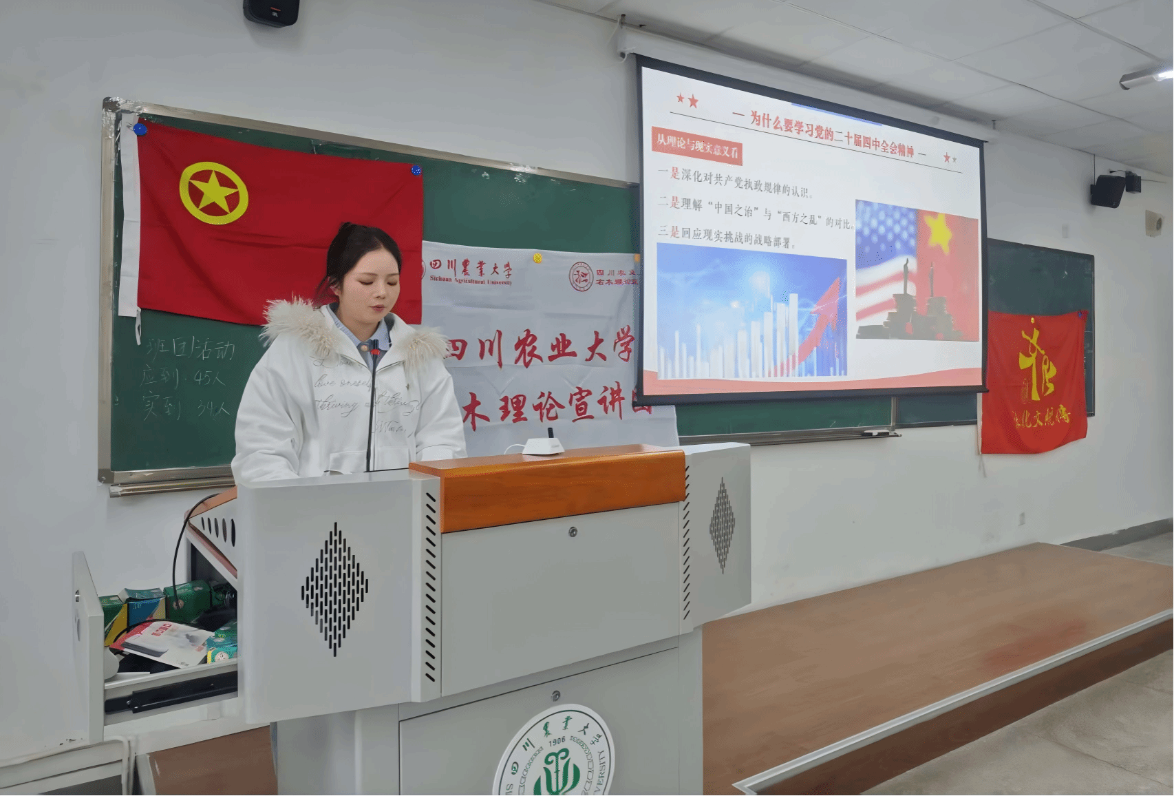 党的二十届四中全会是在即将进入基本实现社会主义现代化夯实基础、全面发力的关键时期召开的一次十分重要的会议。为深入学习领会党的二十届四中全会精神,推动党的创新理论入脑、入心、入行,12月2日,ok138cn太阳集团529右木理论宣讲团成员唐芯雨在学生右木理论宣讲团、传统文化社团联合班团活动上以《认识党的二十届四中全会》为题作宣讲。