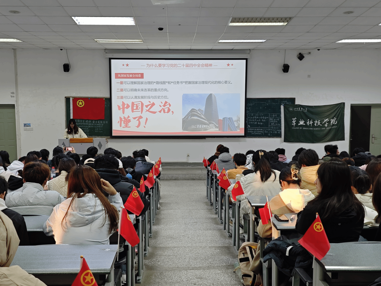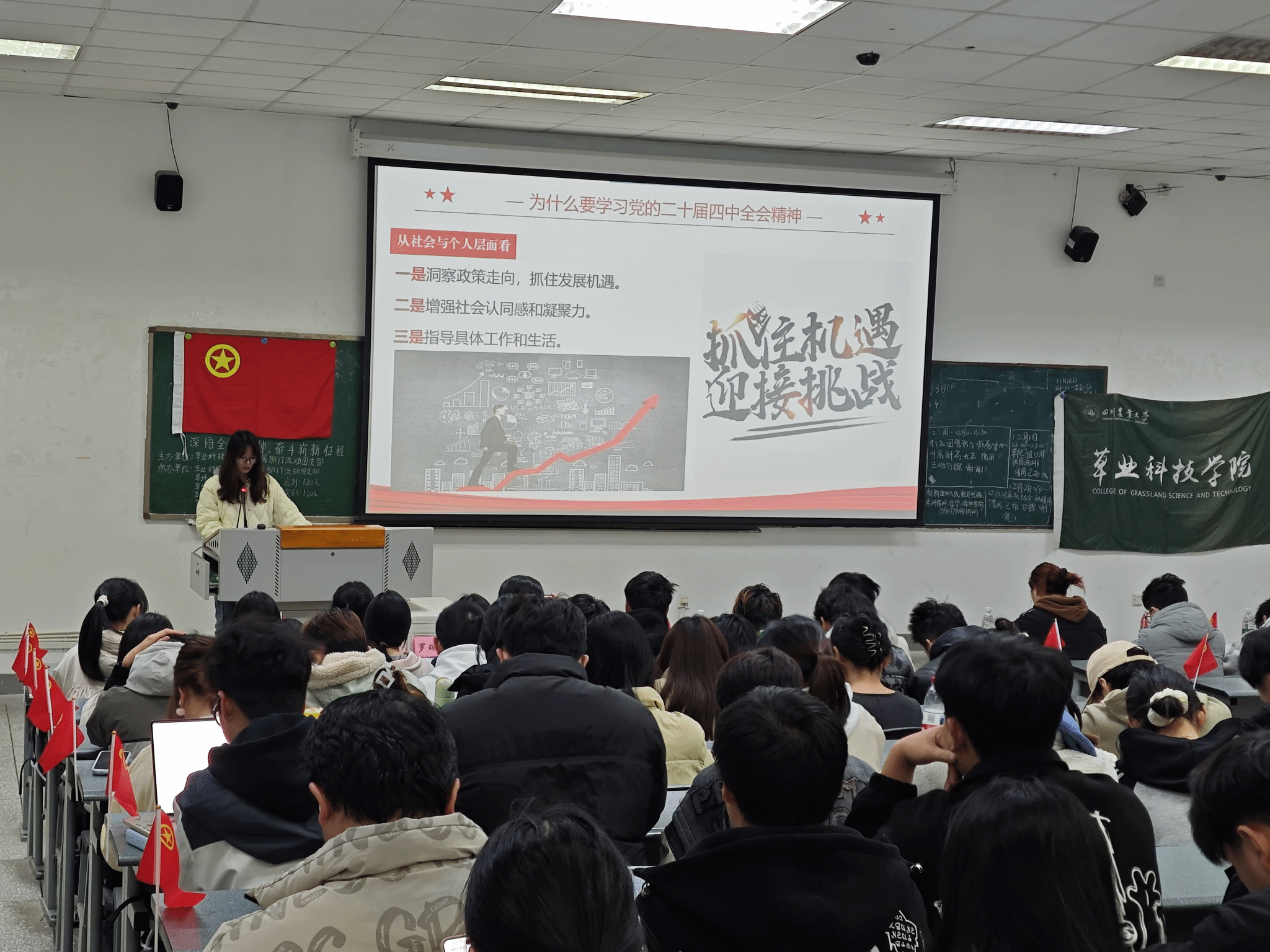 为深入学习贯彻党的二十届四中全会精神,推动党的创新理论在青年学生中落地生根,12月2日下午,ok138cn太阳集团529右木理论宣讲团成员刘静走进草业科技学院示范性班团活动,面向草坪202501班、草学202401班、草坪202401班等6个团支部,开展了以“认识党的二十届四中全会,学习贯彻全会精神”为主题的理论宣讲。