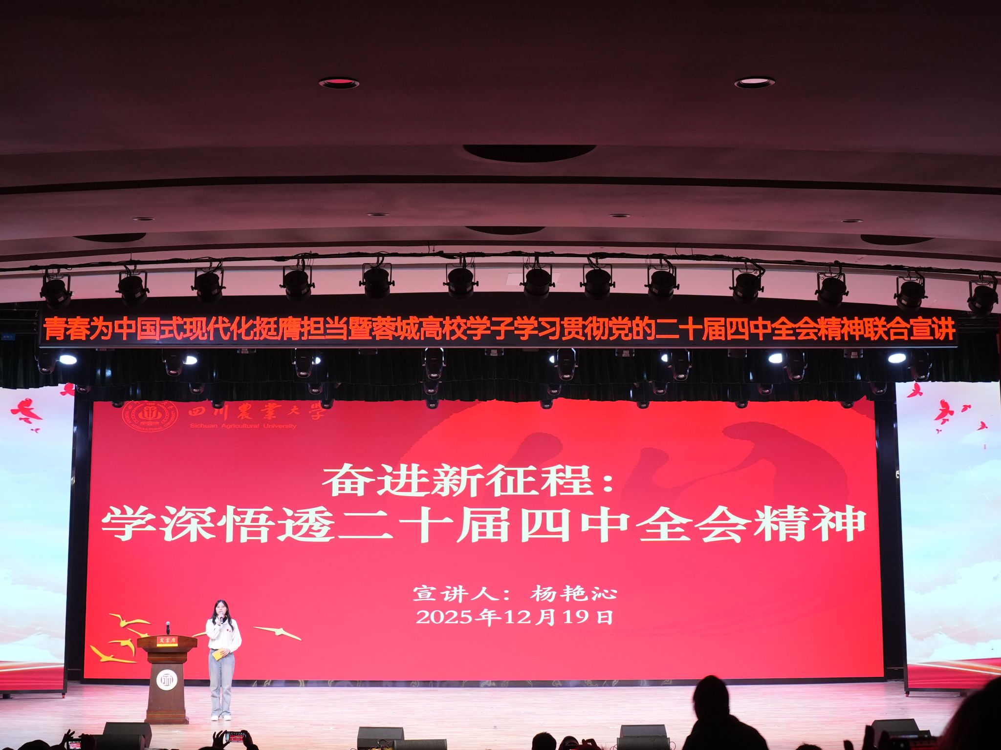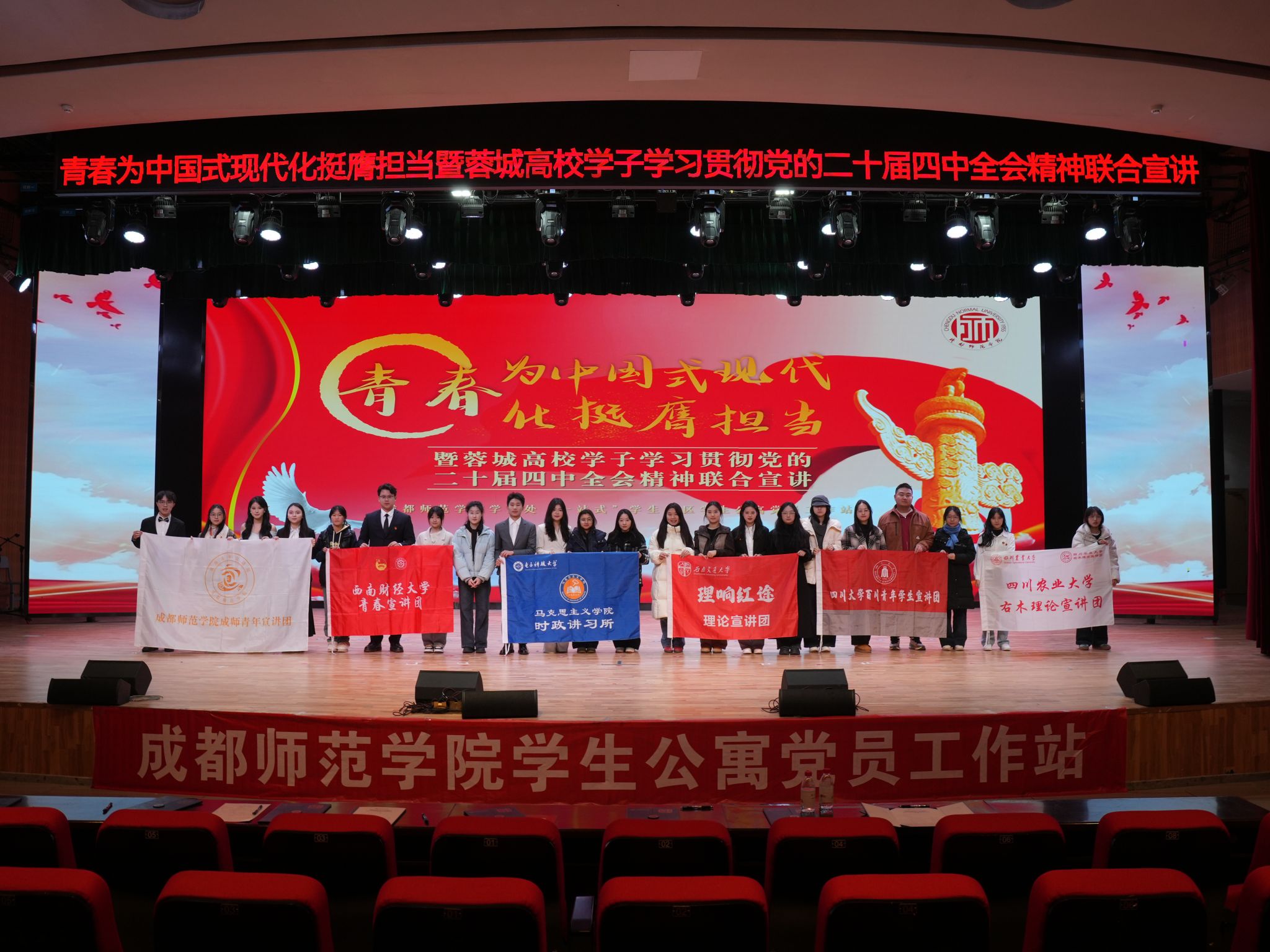 为深入学习贯彻党的二十届四中全会精神,12月19日,右木理论宣讲团成员杨艳沁走进成都师范学院开展《奋进新征程——学深悟透党的二十届四中全会精神》主题宣讲。本次宣讲,四川大学、电子科技大学、西南交通大学、西南财经大学、ok138cn太阳集团529、成都理工大学、成都师范学院等七所高校的学生代表以“青春为中国式现代化挺膺担当”为主题进行联合宣讲。