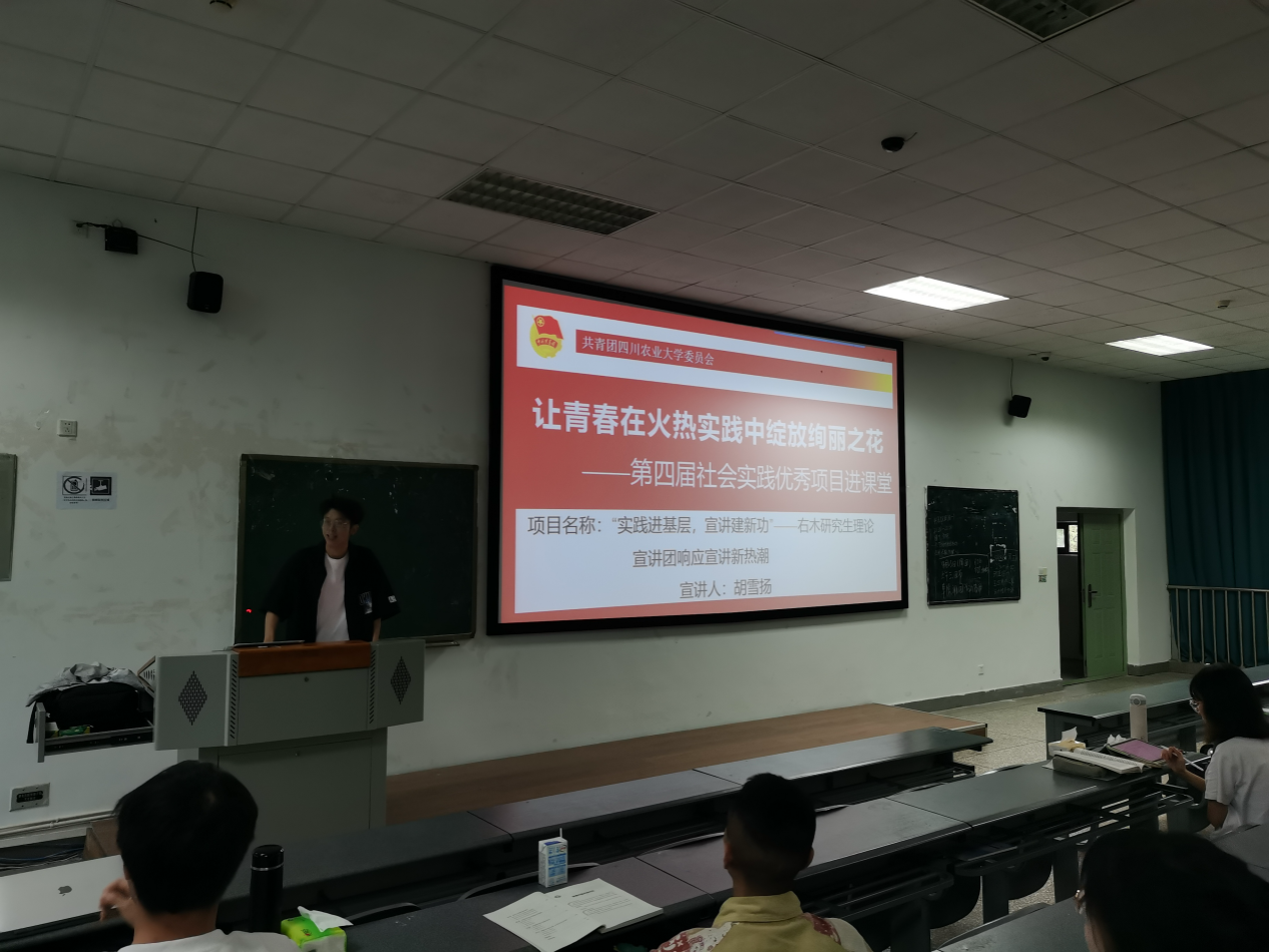 为了让青春在火热实践中绽放绚丽之花,右木研究生理论宣讲团受校团委邀请,积极响应“第四届社会实践优秀项目进课堂”活动的号召。5月8日,右木研究生理论宣讲团成员胡雪扬前往成都校区4教A区202教室面向财务和投资学21级本科生进行理论宣讲。
