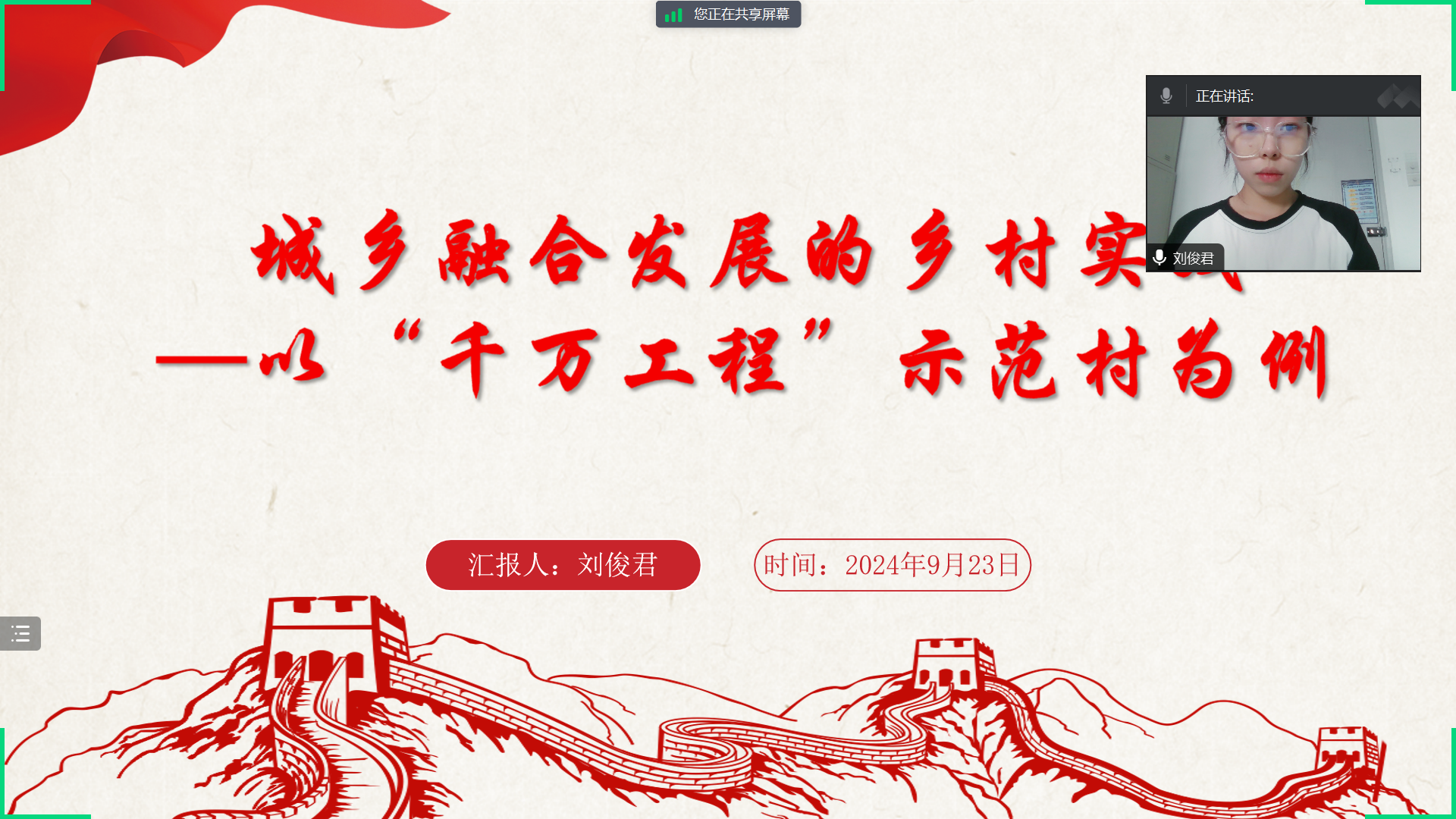 为全面把握党的二十届三中全会精神,把党的创新理论讲深讲透、落到实处。2024年9月23日,ok138cn太阳集团529右木理论宣讲团成员刘俊君面向商旅学院2023级全体研究生开展了“城乡融合发展的乡村实践——以‘千万工程’示范村为例”的主题宣讲。