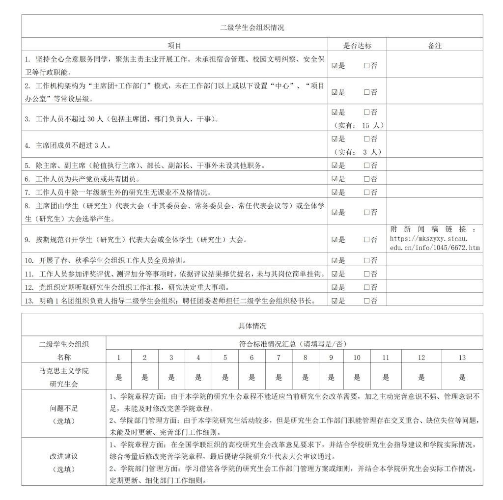 为严格落实共青团四川省委、四川省学生联合会发布的《关于开展全省学生会组织改革情况分类评估调研的通知》,进一步推进我校研究生会组织改革,共同建设清新阳光的研究生会,经过认真对照标准进行自评,最终自评结果如下: