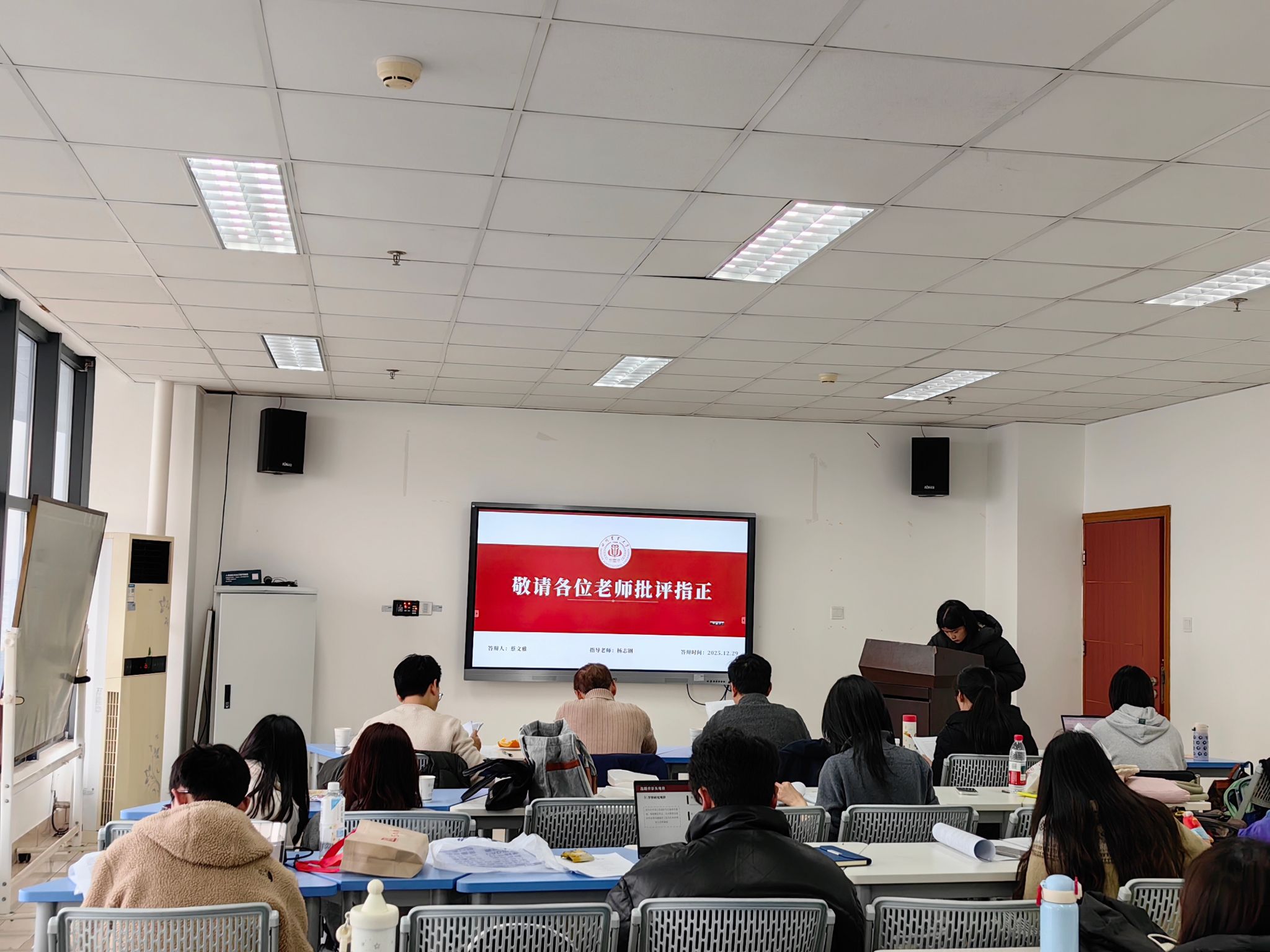 在报告陈述环节,2024级九位硕士研究生依次进行汇报。同学们围绕各自论文的选题背景、理论意义与现实价值、国内外相关研究综述、研究目标与主要内容、基本框架与可能的创新之处等方面进行了系统阐述。答辩现场学术氛围浓厚,汇报过程清晰有序。